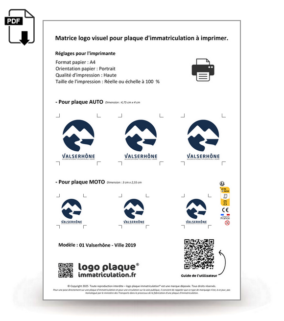 Aux dimensions d'une feuille A4, la matrice regroupe les logos parfaitement ajustés pour les plaques auto et moto.