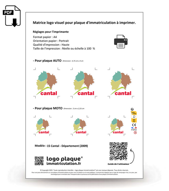 Aux dimensions d'une feuille A4, la matrice regroupe les logos parfaitement ajustés pour les plaques auto et moto.