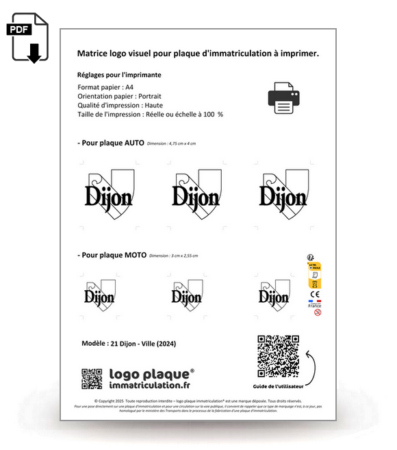Aux dimensions d'une feuille A4, la matrice regroupe les logos parfaitement ajustés pour les plaques auto et moto.