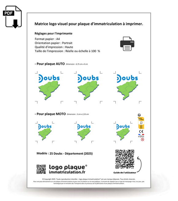 Aux dimensions d'une feuille A4, la matrice regroupe les logos parfaitement ajustés pour les plaques auto et moto.