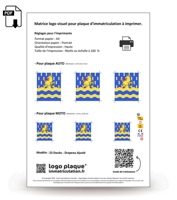 Aux dimensions d'une feuille A4, la matrice regroupe les logos parfaitement ajustés pour les plaques auto et moto.