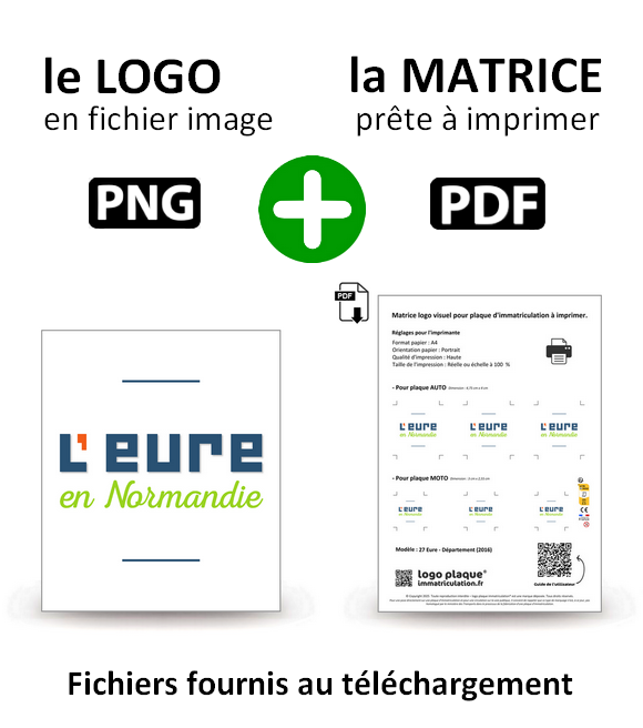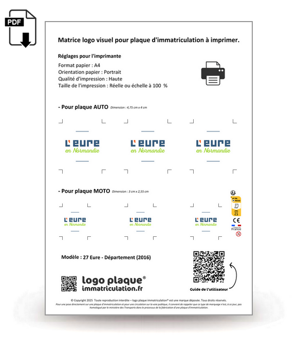• Chaque "Matrice logo" comprend des logos aux dimensions pour les plaques auto et moto. Les "Matrices logos" sont directement prêtes à être imprimées sans aucune retouche, ni aucune connaissance spéciale.