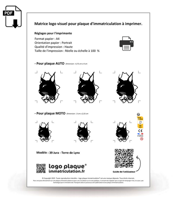 Aux dimensions d'une feuille A4, la matrice regroupe les logos parfaitement ajustés pour les plaques auto et moto.