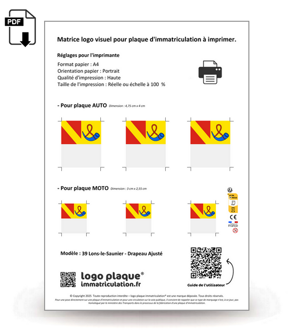 Aux dimensions d'une feuille A4, la matrice regroupe les logos parfaitement ajustés pour les plaques auto et moto.