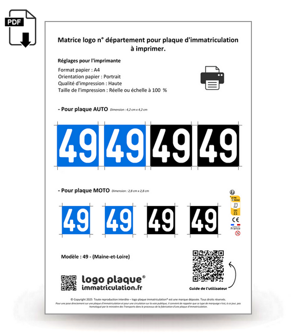 Aux dimensions d'une feuille A4, la matrice regroupe les logos parfaitement ajustés pour les plaques auto et moto.