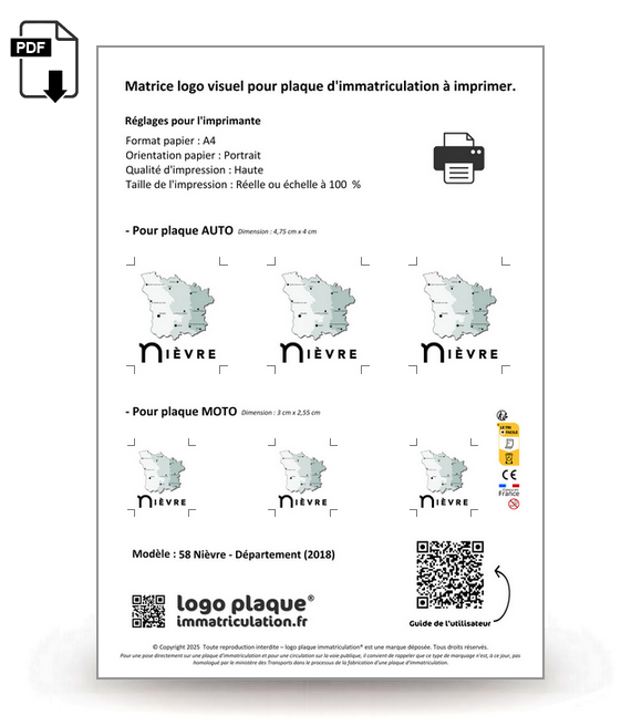 Aux dimensions d'une feuille A4, la matrice regroupe les logos parfaitement ajustés pour les plaques auto et moto.