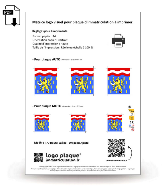 Aux dimensions d'une feuille A4, la matrice regroupe les logos parfaitement ajustés pour les plaques auto et moto.