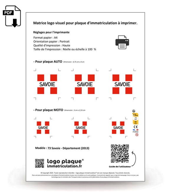 Aux dimensions d'une feuille A4, la matrice regroupe les logos parfaitement ajustés pour les plaques auto et moto.