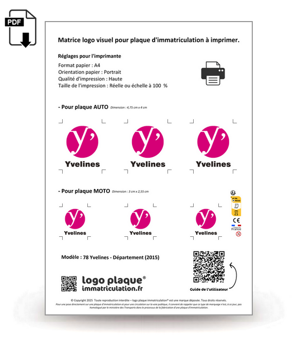 Aux dimensions d'une feuille A4, nos matrices regroupent les logos parfaitement ajustés pour les plaques auto et moto. Prêtes à l'emploi, elles s'impriment directement, sans aucune retouche ni connaissance technique — Un résultat professionnel en toute simplicité.