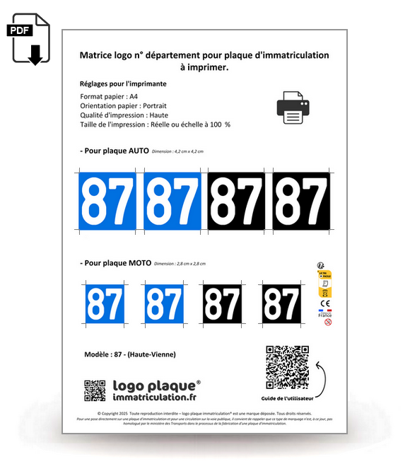 Aux dimensions d'une feuille A4, la matrice regroupe les logos parfaitement ajustés pour les plaques auto et moto.