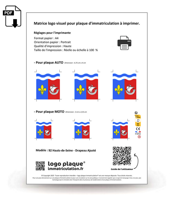 Aux dimensions d'une feuille A4, nos matrices regroupent les logos parfaitement ajustés pour les plaques auto et moto. Prêtes à l'emploi, elles s'impriment directement, sans aucune retouche ni connaissance technique — Un résultat professionnel en toute simplicité.