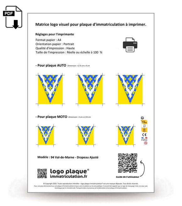 • Chaque "Matrice logo" comprend des logos aux dimensions pour les plaques auto et moto. Les "Matrices logos" sont directement prêtes à être imprimées sans aucune retouche, ni aucune connaissance spéciale.