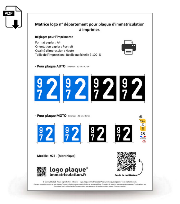 Aux dimensions d'une feuille A4, la matrice regroupe les logos parfaitement ajustés pour les plaques auto et moto.