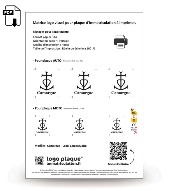 Aux dimensions d'une feuille A4, la matrice regroupe les logos parfaitement ajustés pour les plaques auto et moto.