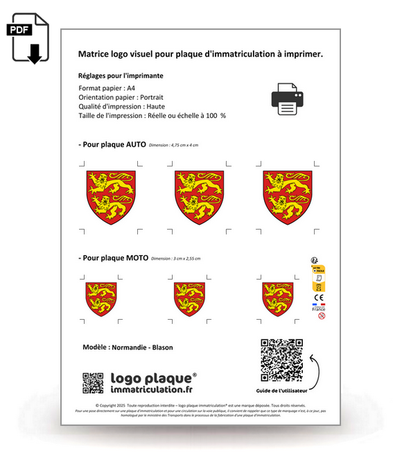 • Chaque "Matrice logo" comprend des logos aux dimensions pour les plaques auto et moto. Les "Matrices logos" sont directement prêtes à être imprimées sans aucune retouche, ni aucune connaissance spéciale.