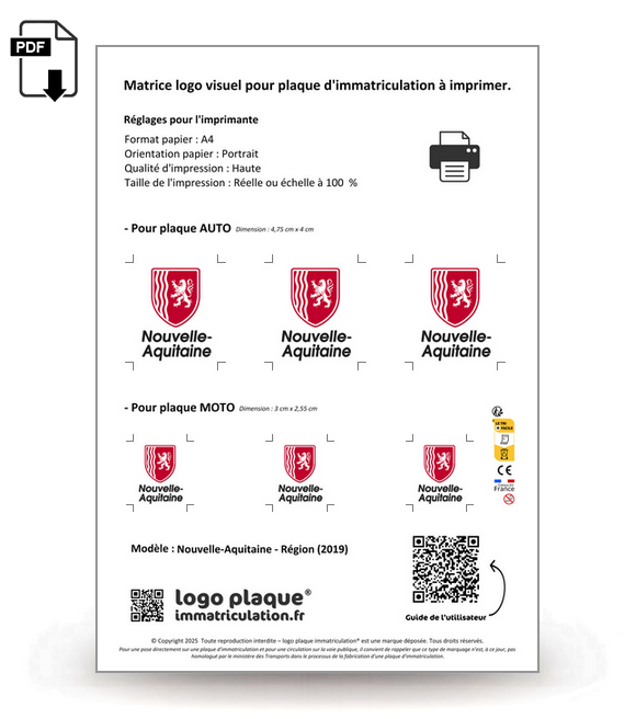 • Chaque "Matrice logo" comprend des logos aux dimensions pour les plaques auto et moto. Les "Matrices logos" sont directement prêtes à être imprimées sans aucune retouche, ni aucune connaissance spéciale.