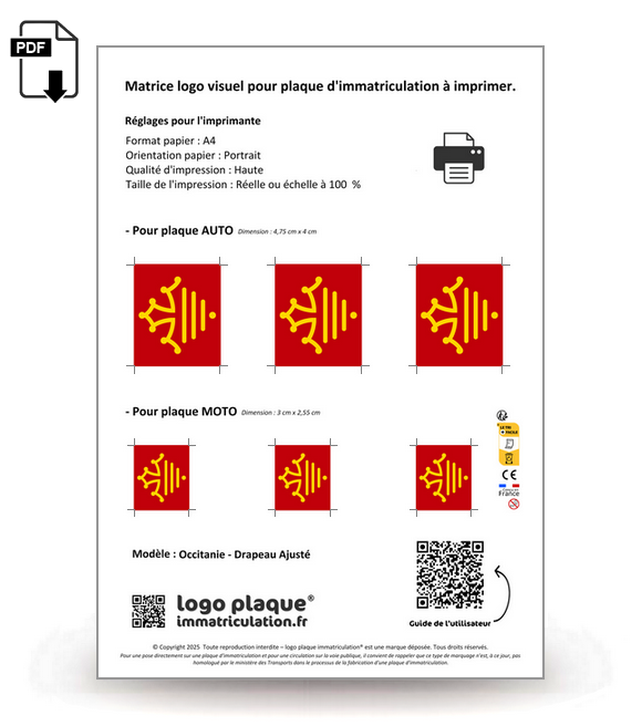 Aux dimensions d'une feuille A4, la matrice regroupe les logos parfaitement ajustés pour les plaques auto et moto.